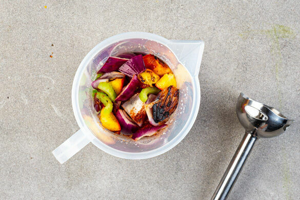 Das zerkleinerte Obst und Gemüse mit ½TL Paprikapulver, 1EL Honig, 1EL Essig, und 1 kräftigen Prise Salz pürieren. Je nach gewünschter Konsistenz ggf. etwas Wasser hinzugeben. Nach Geschmack mit mehr Honig, Essig und Salz nachwürzen.