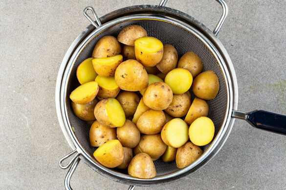 Den Grill bei mittlerer Hitze vorheizen. In einem mittelgroßen Topf ausreichend gesalzenes Wasser für die Kartoffeln zum Kochen bringen. Die Kartoffeln samt Schale halbieren, dann in das kochende Wasser geben und in 12–14Min. gar kochen. In ein Sieb abgießen und ausdampfen lassen.