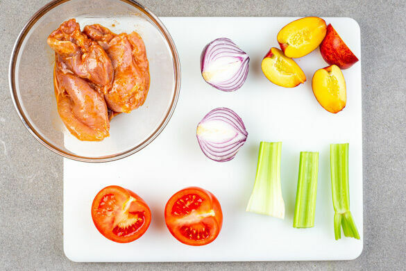 1TL Paprikapulver, 2EL Honig, 2EL Olivenöl, 2EL Essig und 1TL Salz verrühren. Das Fleisch trocken tupfen und mit dem Würzöl vermengen. Die Nektarinen vierteln, dabei den Stein entfernen. Die Zwiebeln schälen und halbieren. Die Tomaten ebenfalls halbieren. 1 Stangensellerie in 3 Stücke schneiden.