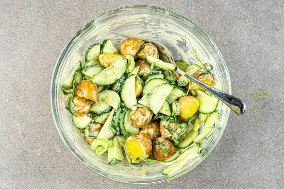 Den übrigen Stangensellerie in dünne Scheiben schneiden. Die Gurken längs halbieren und in dünne Scheiben schneiden. Die Basilikumblätter abzupfen und grob schneiden. 2EL Mayonnaise mit 2TL Senf, 2EL Essig sowie je 1 kräftigen Prise Salz und Pfeffer verrühren. Die Kartoffeln, die Selleriescheiben, die Gurken und die ½ des Basilikums mit dem Dressing vermengen.