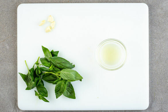 Den Backofen auf 240°C (220°C Umluft) vorheizen. Das Basilikum samt Stängeln grob zerzupfen. Den Knoblauch schälen und vierteln. Die Zitrone halbieren und auspressen.