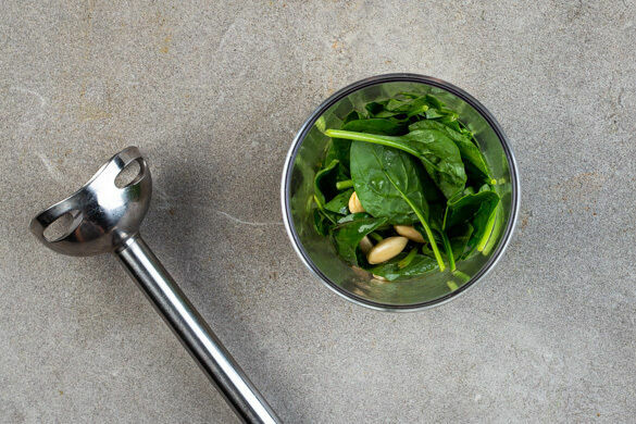 Das Basilikum und den Knoblauch mit den Mandelblättchen, 2EL Olivenöl, 1TL Zitronensaft sowie dem Spinat in einem hohen Gefäß mit einem Stabmixer zu einem glatten Pesto pürieren. Mit Salz und Pfeffer abschmecken. Tipp: Den Spinat nach und nach hinzugeben.