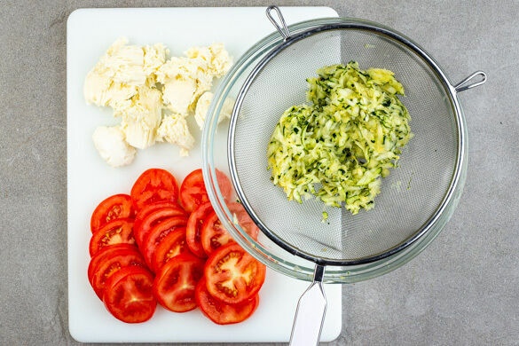 Die Zucchini mit einer Küchenreibe grob raspeln. In einer Schüssel leicht salzen, kurz ziehen lassen und anschließend in einem Sieb gut ausdrücken. Die Tomaten in 0,5–1cm dicke Schreiben schneiden. Den Mozzarella abtropfen lassen und in grobe Stücke zupfen.