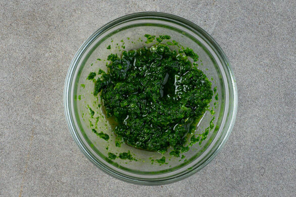 Die Salbeiblätter abzupfen. Die Petersilie samt Stängeln grob schneiden. Den Knoblauch schälen und halbieren. Die Zitrone halbieren und eine Hälfte auspressen. Die Kräuter, den Knoblauch und den Zitronensaft in einem hohen Gefäß pürieren, anschließend 1TL Olivenöl unterrühren. Tipp: Wer es besonders spritzig mag, kann auch mehr Zitronensaft verwenden.