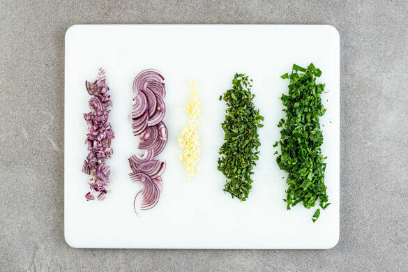In einem mittelgroßen Topf 600ml leicht gesalzenes Wasser für den Bulgur zum Kochen bringen. Die Zwiebel schälen und halbieren, dann eine Hälfte fein würfeln, die andere Hälfte in feine Streifen schneiden. Den Knoblauch schälen und fein würfeln. Die Petersilie samt Stängeln fein hacken.