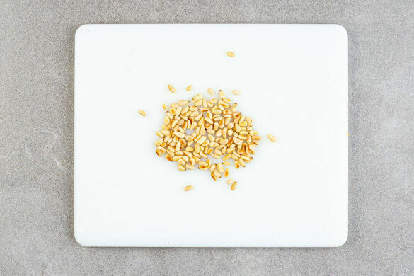Die Pinienkerne in einer großen Pfanne ohne Zugabe von Fett bei mittlerer Hitze 1–2Min. goldbraun anrösten. Vorsicht, sie können schnell zu dunkel werden. Zum Abkühlen herausnehmen, beiseitestellen und die Pfanne aufbewahren.
