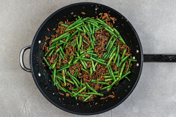 Die Zwiebelwürfel in der Pfanne mit 2EL Olivenöl bei mittlerer Hitze 2–3Min. glasig anbraten. Den Knoblauch und die Bohnen hinzugeben und 3–4Min. mitbraten. Das Hackfleisch, die Gewürzmischung und die getrocknete Minzeeinrühren und 6–7Min. weiterbraten, bis das Fleisch appetitlich gebräunt ist und die Bohnen gar sind.