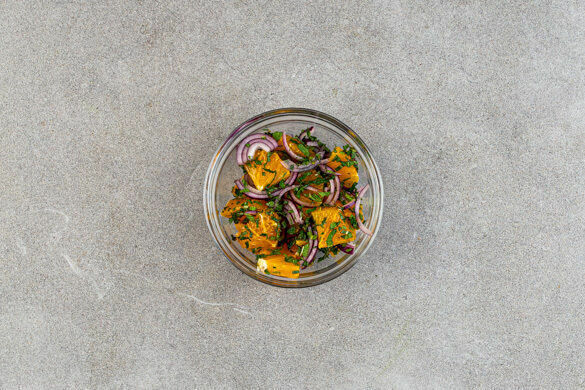 Die Orangen mit einem Messer schälen, dabei auch die weiße Haut entfernen. Das Fruchtfleisch zwischen den Häutchen in Spalten herausschneiden. Die Orangenstücke mit den Zwiebelstreifen, der ½ der Petersilie und 2EL Olivenöl vermengen. Den Salat mit Salz und Pfeffer abschmecken.