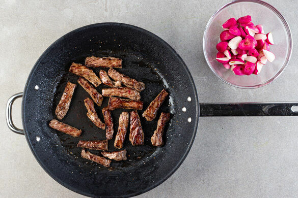 Die Radieschen in einer mittelgroßen Pfanne ohne Zugabe von Fett bei starker Hitze 3–5Min. anbraten, dann mit 1 Prise Salz würzen und aus der Pfanne nehmen. Das Fleisch trocken tupfen und in derselben Pfanne mit 1TL Pflanzenöl und je 1 Prise Salz und Pfeffer bei mittlerer bis starker Hitze 2–3Min. goldbraun braten, dabei einmal wenden.