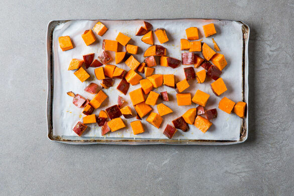 Den Backofen auf 220°C (200°C Umluft) vorheizen. Die Süßkartoffel in ca. 2cm große Würfel schneiden und auf einem mit Backpapier ausgelegten Backblech mit 1EL Pflanzenöl und je 1 Prise Salz und Pfeffer vermengen. Anschließend im Ofen in 12–15Min. goldbraun und gar rösten.