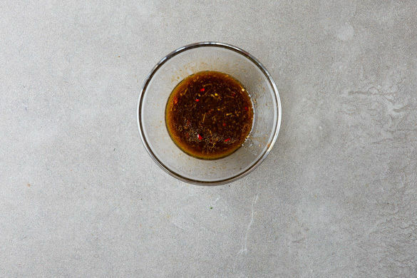 Die Knoblauch-Ingwer-Paste mit der Sojasauce, der Hoisinsauce, 2EL Pflanzenöl, 2EL hellem Essig, 3EL Wasser und ½TL Zucker gut verrühren. Nach Geschmack Peperoni unterrühren.