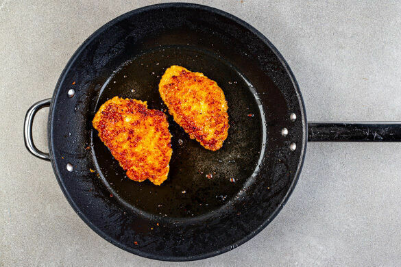 Die Hähnchenschnitzel in einer großen Pfanne mit 2EL Olivenöl bei mittlerer bis starker Hitze auf jeder Seite 2–3Min. braten, bis die Schnitzel goldbraun und knusprig sind.