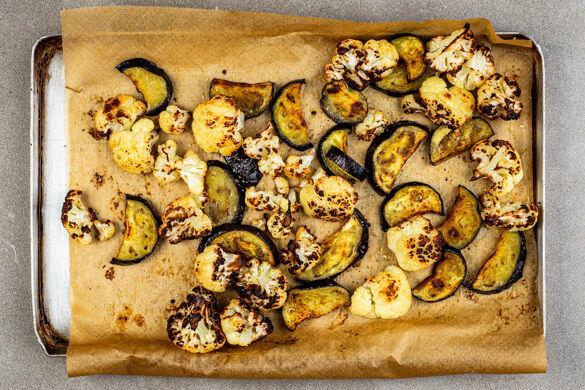 Den Blumenkohl in mundgerechte Röschen, und den Strunk in ca. 1cm große Würfel schneiden. Die Aubergine längs halbieren und in ca. 1cm dicke Scheiben schneiden. Das Gemüse mit 2EL Pflanzenöl und ½TL Salz vermengen und auf einem mit Backpapier ausgelegten Backblech verteilen. Im Ofen in 20–25Min. goldbraun rösten, nach der Hälfte der Garzeit einmal wenden.
