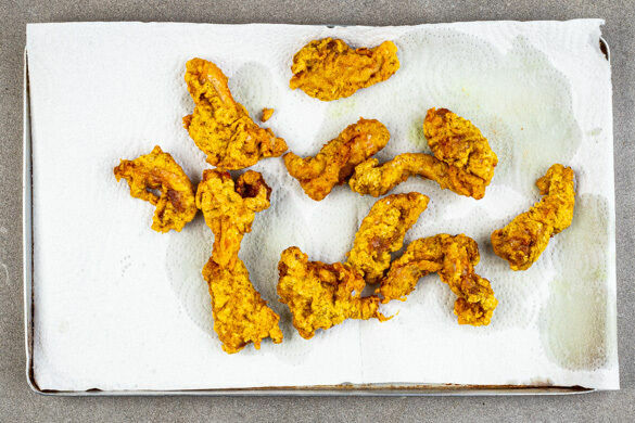 Eine große Pfanne oder einen Wok ca. 2cm hoch mit Pflanzenöl befüllen und stark erhitzen. Das Öl ist heiß genug, wenn 1 Stück Fleisch in ca. 30Sek. bräunt. Das Fleisch ca. 3Min. im heißen Öl goldbraun frittieren. Dabei vorsichtig rühren, damit das Fleisch nicht aneinanderhaftet. Mit einer Schaumkelle herausheben und auf Küchenkrepp abtropfen lassen, dann mit 1 Prise Pfeffer würzen.