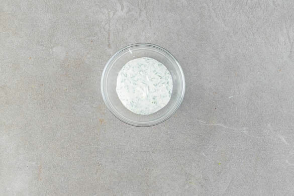 Den Knoblauch schälen und fein reiben. 6EL vegane Mayonnaise mit dem Knoblauch, den Dillspitzen und 2–3EL Wasser zu einem cremigen Dip verrühren.