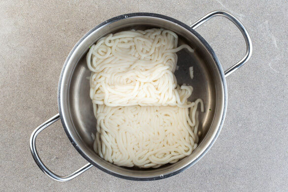 Die Nudeln in das kochende Wasser geben und bei mittlerer Hitze in 2–3Min. gar ziehen lassen. In ein Sieb abgießen und abtropfen lassen.