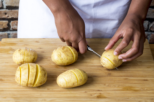 Den Backofen auf 220°C (200°C Umluft) vorheizen. Die Kartoffeln in Abständen von ca. 0,5cm tief ein-, aber nicht durchschneiden: Die Kartoffeln sollten nicht auseinanderfallen, sondern fächerartig aufklappen.