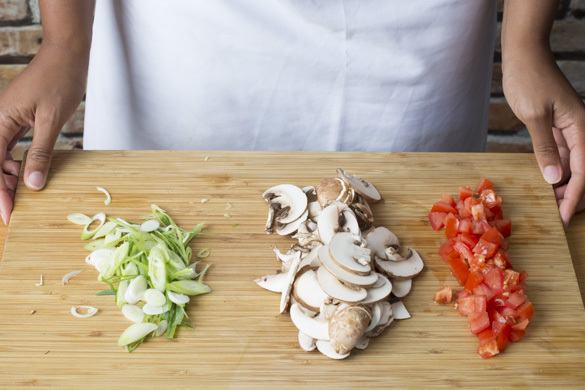 Die Tomaten in 1–2cm große Würfel schneiden. Die Champignons ggf. säubern und in dünne Scheiben schneiden. Die Lauchzwiebel schräg in feine Ringe schneiden.