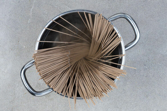 ⅔ der Nudeln in das kochende Wasser geben und in ca. 4Min. bissfest kochen. 1 Tasse Nudelwasser abschöpfen, dann die Nudeln in ein Sieb abgießen, gründlich mit kaltem Wasser abspülen und abtropfen lassen. Die Nudeln zurück in den Topf geben.