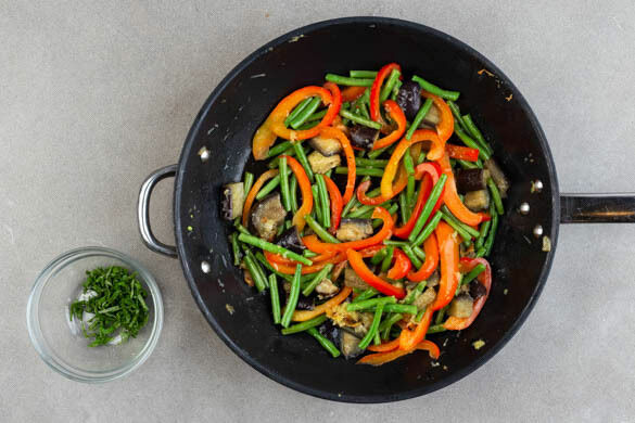 Die Paprika vierteln, entkernen und in dünne Streifen schneiden. Die Paprika und die Bohnen mit je 1 kräftigen Prise Salz und Pfeffer in die Pfanne zu den Auberginen geben und 6–8Min. braten.