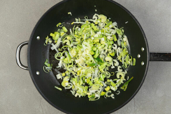 Den Lauch längs halbieren, dann in dünne Streifen schneiden. In einer großen Pfanne mit 1EL Pflanzenöl und 1 Prise Salz bei mittlerer Hitze ca. 2Min. anbraten, bis der Lauch weich wird. In eine große Schüssel umfüllen. Die Pfanne auswischen und beiseitestellen.
