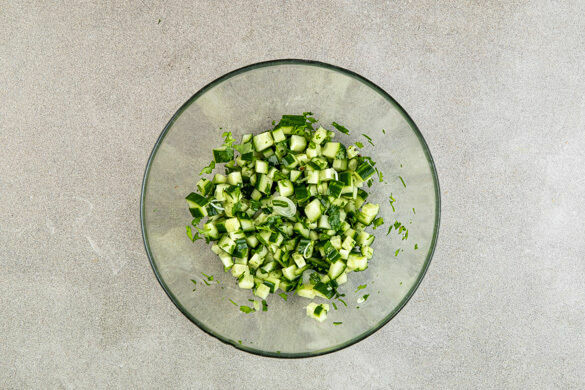 Die Limette halbieren und auspressen, dann den Limettensaft mit je 1 kräftigen Prise Salz und Pfeffer würzen. Die Gurke in ca. 1cm große Würfel schneiden. Die Lauchzwiebel in dünne Ringe schneiden. Den Koriander samt Stängeln fein schneiden. Die Gurken, die Lauchzwiebeln und den Koriander mit dem Limettensaft zu einer Salsa vermengen.