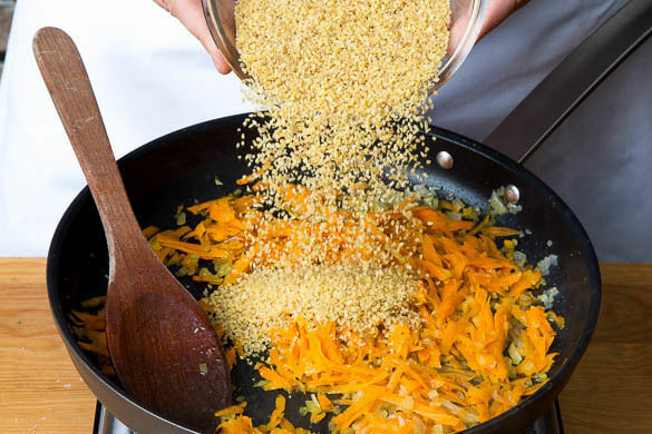 Die Karotten und die restlichen Zwiebeln in einer großen Pfanne mit 2EL Olivenöl bei mittlerer Hitze 1–2Min. anbraten. Den Bulgur, das Brühgewürz und 600ml Wasser dazugeben, kurz aufkochen lassen und abgedeckt bei niedriger Hitze 5–7Min. sanft köcheln lassen, bis das Wasser aufgesaugt und der Bulgur gar ist.