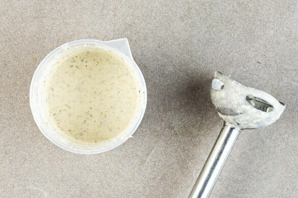 Den Knoblauch schälen. Den Käse grob reiben, dann mit dem Knoblauch, der ½ der Kapern, 2EL Mayonnaise und 1EL Essig in einem hohen Gefäß mit einem Stabmixer zu einem cremigen Dressing pürieren. Ggf. etwas Wasser hinzufügen, falls das Dressing zu dickflüssig ist. Mit Salz und Pfeffer abschmecken.