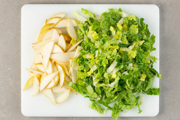 Die Birnen vierteln, entkernen und in dünne Scheiben schneiden. Den Romanasalat in dünne Streifen schneiden.