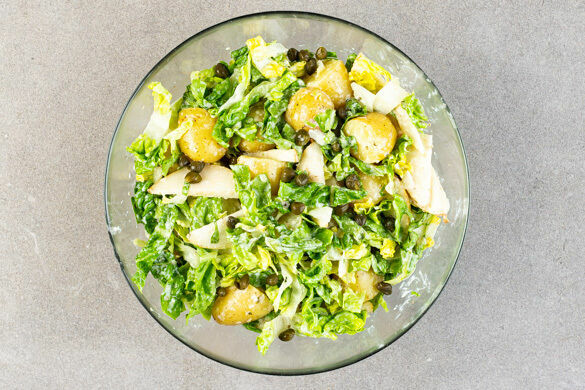 Den Romanasalat, die Birnen und die Kartoffeln vorsichtig mit dem Dressing vermengen.