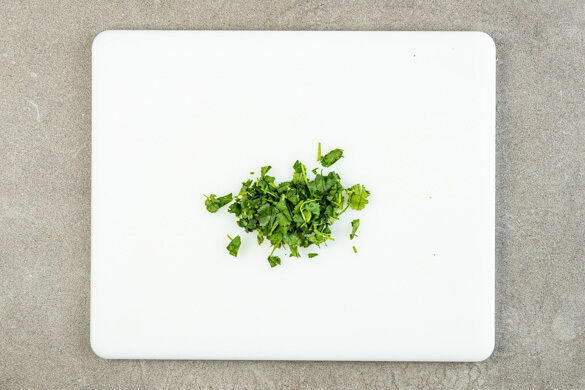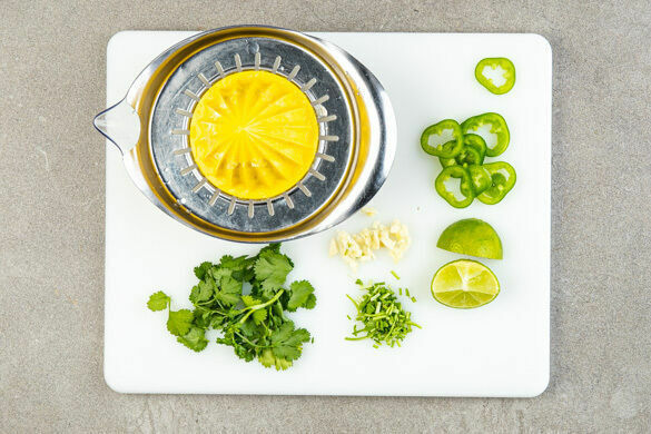 In einem mittelgroßen Topf 600ml leicht gesalzenes Wasser für den Reis zum Kochen bringen. Den Knoblauch schälen und fein würfeln. Die Chilischote in feine Ringe schneiden. Eine Limette halbieren und auspressen, die andere Limette in 4 Spalten schneiden. Die Korianderblätter von den Stängeln zupfen und die Stängel grob schneiden.