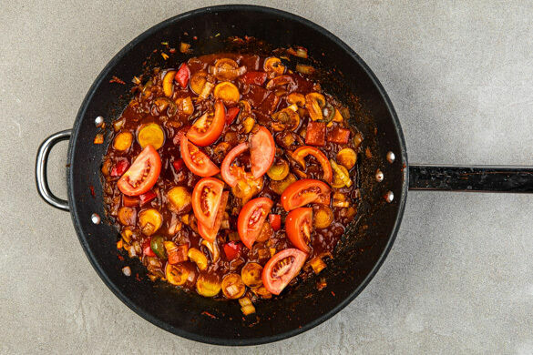 Inzwischen die Tomate in ca. 1cm breite Spalten schneiden. Den Limettensaft, 150ml Wasser und die ½ des Brühgewürzes zum Gemüse in die Pfanne geben und aufkochen, dann bei mittlerer bis niedriger Hitze ca. 1Min. einköcheln lassen. Die Tomaten und 1 kräftige Prise Zucker unterheben und ca. 1Min. erwärmen.
