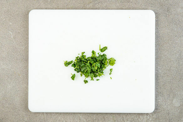 In einem kleinen Topf 300ml leicht gesalzenes Wasser für den Reis zum Kochen bringen. Den Knoblauch schälen und fein würfeln. Die ½ der Chilischote in feine Ringe schneiden. Die Limette halbieren, eine Hälfte auspressen, die andere Hälfte in 2 Spalten schneiden. Die Korianderblätter von den Stängeln zupfen und die Stängel grob schneiden.