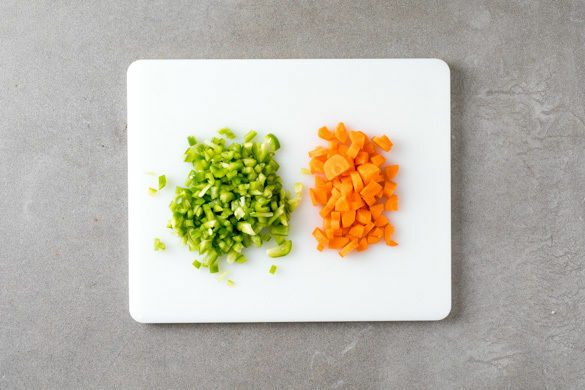 Die Paprika vierteln, entkernen und in kleine Würfel schneiden. Die Karotte ggf. schälen, längs vierteln und in ca. 0,5cm kleine Würfel schneiden.