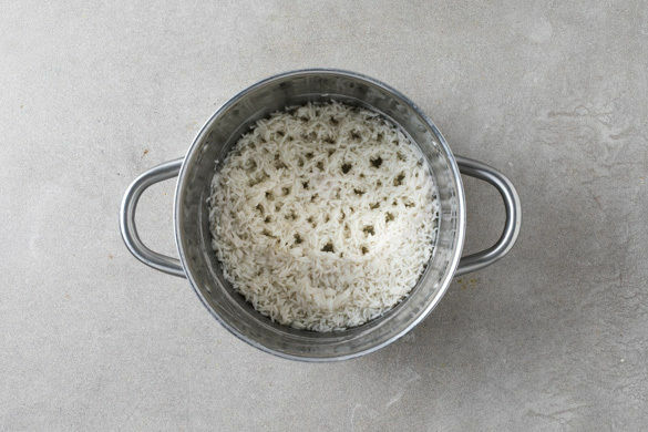 Den Reis in einem Sieb kalt abspülen, bis das Wasser klar bleibt. Sobald das Wasser kocht, den Reis hineingeben und abgedeckt bei niedrigster Hitze 12–14Min. kochen, bis das Wasser aufgesogen und der Reis gar ist. Noch ca. 5Min. ohne Hitzezufuhr ziehen lassen.