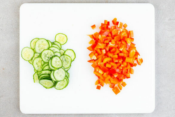 Die Paprika vierteln, entkernen und in ca. 1cm große Würfel schneiden. Die Gurke in dünne Scheiben schneiden. Den Fisch mit kaltem Wasser abspülen, trocken tupfen und evtl. vorhandene Gräten mit einer Pinzette entfernen.