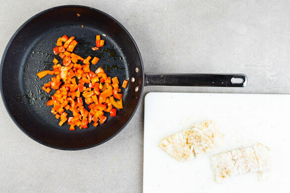 Den Fisch in einer mittelgroßen Pfanne mit 2EL Olivenöl bei mittlerer bis starker Hitze ca. 3Min. anbraten. Mit 1 Prise Salz und der ½ der Gewürzmischung würzen. Den Fisch wenden und erneut ca. 3Min. braten, bis er gar ist, dann auf einem Teller beiseitestellen. Die Paprika in derselben Pfanne bei mittlerer bis starker Hitze ca. 2Min. braten und mit 1 Prise Salz würzen.