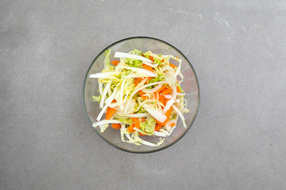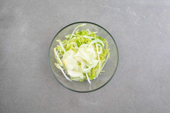 Die Zwiebel schälen, halbieren und in feine Streifen schneiden. Den Romanasalat in ca. 2cm breite Streifen schneiden, dann mit den Zwiebeln, ½TL Salz und ½TL Zucker vermengen.