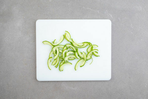Die Gurke längs vierteln, ggf. das Kerngehäuse mit einem Löffel entfernen und die Gurke schräg in dünne Streifen schneiden.