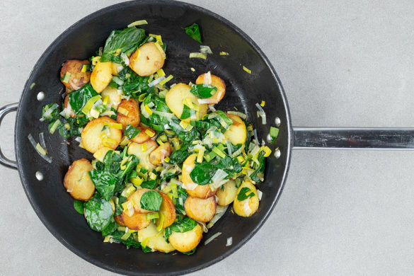 Die Kartoffeln in ca. 0,5cm dünne Scheiben schneiden und in einer großen Pfanne mit 2EL Olivenöl bei mittlerer Hitze in ca. 10Min. knusprig braten. Den Lauch dazugeben und ca. 2Min. mitbraten, dann den Spinat unterheben und zusammenfallen lassen. Mit Salz und Pfeffer abschmecken.
