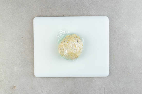 3EL eiskaltes Wasser auf dem Teig verteilen, alles gut verrühren und den Teig mit den Händen so lange kneten, bis er sich zu einer klebrigen Kugel formen lässt. Dann in Frischhaltefolie einwickeln und ins Gefrierfach legen. Achtung: Den Teig nicht länger als notwendig kneten! Tipp: Die übrige Butter wird für dieses Rezept nicht benötigt und kann eingefroren werden.