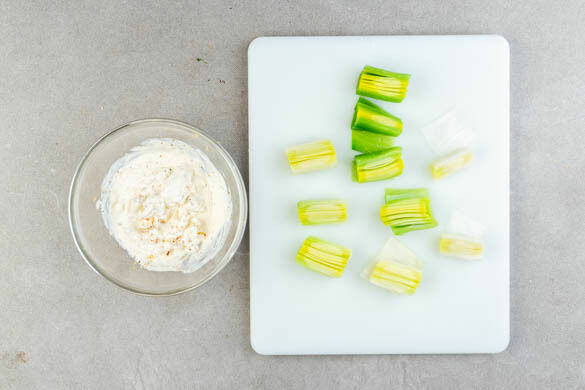 In einem kleinen Topf ausreichend gesalzenes Wasser für den Lauch zum Kochen bringen. Den Lauch in ca. 4cm lange Stücke schneiden. Die ½ der Zitronenschale abreiben. Den zerkrümelten Feta mit der Crème fraîche, der Gewürzmischung und der Zitronenschale verrühren, mit Pfeffer würzen. Den Lauch im kochenden Wasser 3–4Min. blanchieren, abgießen und längs aufschneiden.