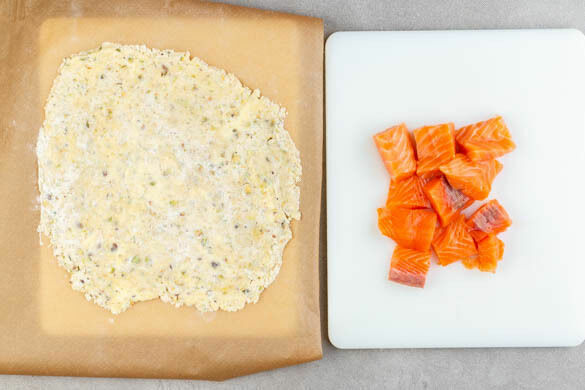 Den Fisch kalt abspülen und trocken tupfen, Haut und evtl. vorhandene Gräten entfernen. In ca. 4cm große Stücke schneiden. Zwei Stücke Backpapier mit je ½EL Mehl bestäuben. Den Teig halbieren, auf dem Papier mit dem übrigen Mehl bestäuben und zu zwei ca. 28cm großen Kreisen ausrollen, Ungleichmäßigkeiten stören nicht. Mehr Mehl aufstreuen, falls der Teig sehr klebrig ist.