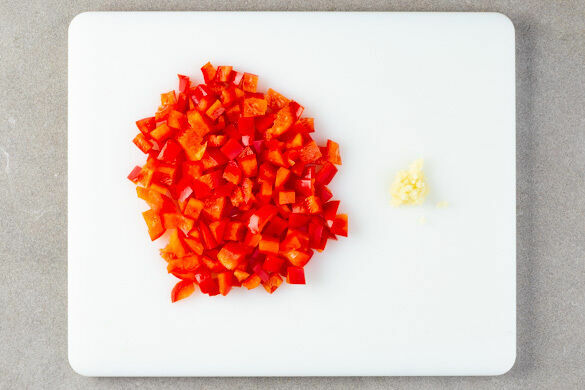 In einem Wasserkocher 350ml Wasser zum Kochen bringen. Tipp: Die nach Wasserkocher variierende Mindestmenge beachten und ggf. mehr Wasser aufkochen. Die Paprika vierteln, entkernen und in ca. 1cm große Stücke schneiden. Den Knoblauch schälen und fein würfeln.