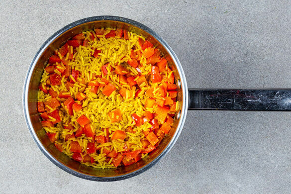 Den Reis mit 350ml kochendem Wasser zur Paprika in den Topf geben und alles zum Kochen bringen. Abgedeckt bei niedrigster Hitze 8–10Min. kochen, bis das Wasser aufgesogen und der Reis gar ist. Noch ca. 5Min. ohne Hitzezufuhr ziehen lassen.