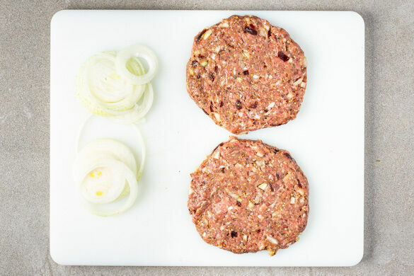 Die Zwiebel schälen und quer halbieren, dann eine Hälfte fein würfeln und die andere Hälfte in dünne Ringe schneiden. Die Zwiebelwürfel mit dem Hackfleisch, der Zwiebelmarmelade, der Kräuter-Gewürzmischung, 1EL Senf, ½TL Salz und 1 kräftigen Prise Pfeffer verkneten. Die Hackmasse in 2 gleich große Pattys mit ca. 10cm Durchmesser formen.