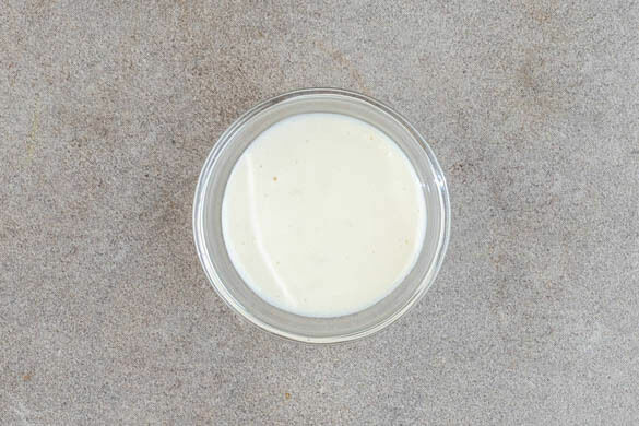 Den Knoblauch schälen und sehr fein würfeln oder durch eine Knoblauchpresse drücken. Den Knoblauch mit 1½EL veganer Mayonnaise und dem Sesamöl verrühren. Ggf. teelöffelweise Wasser zugeben, bis eine dickflüssige Konsistenz entsteht. Mit Salz abschmecken.