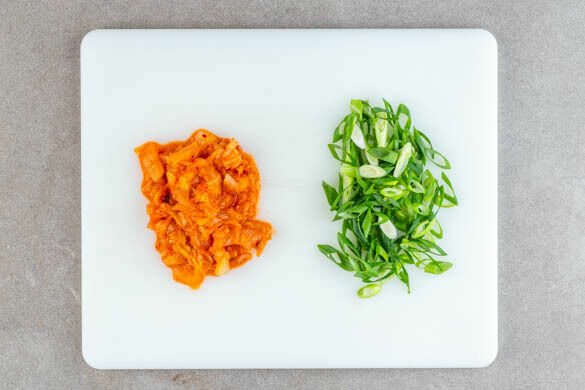 Die Lauchzwiebeln schräg in feine Ringe schneiden. Das Kimchi fein schneiden.