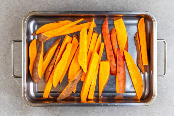 Den Backofen auf 240°C (220°C Umluft) vorheizen. Die Süßkartoffel samt Schale in ca. 2cm breite, pommesartige Stifte schneiden und in eine große Auflaufform geben.