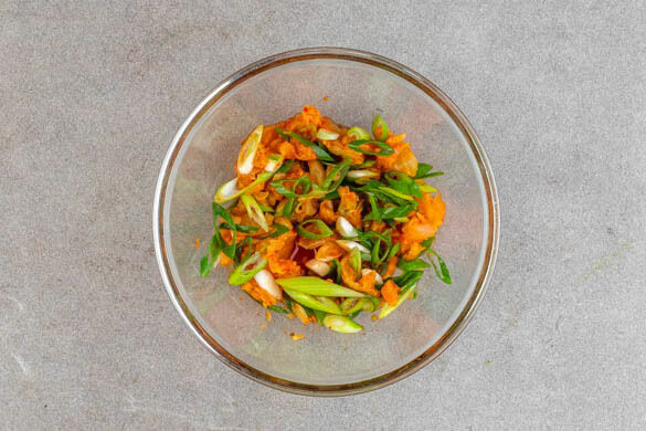 Die Lauchzwiebeln schräg in feine Ringe schneiden. Das Kimchi fein schneiden.